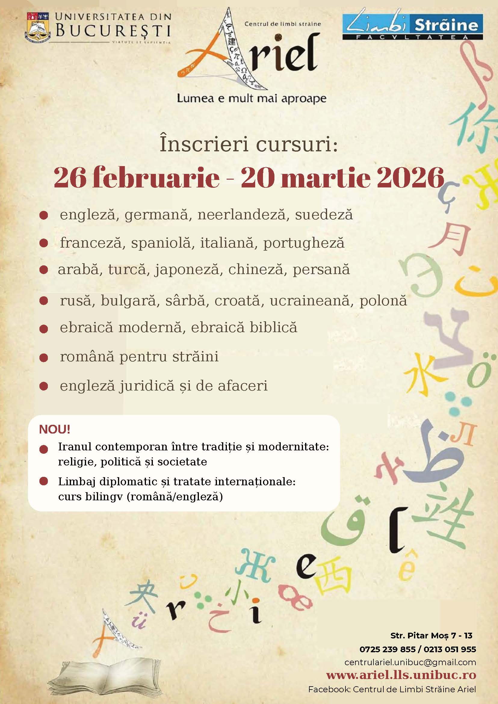În perioada 26 februarie – 20 martie 2026 organizăm înscrieri (fizic și online) la toate cursurile de limbi străine care se regăsesc în prezentarea de mai jos.